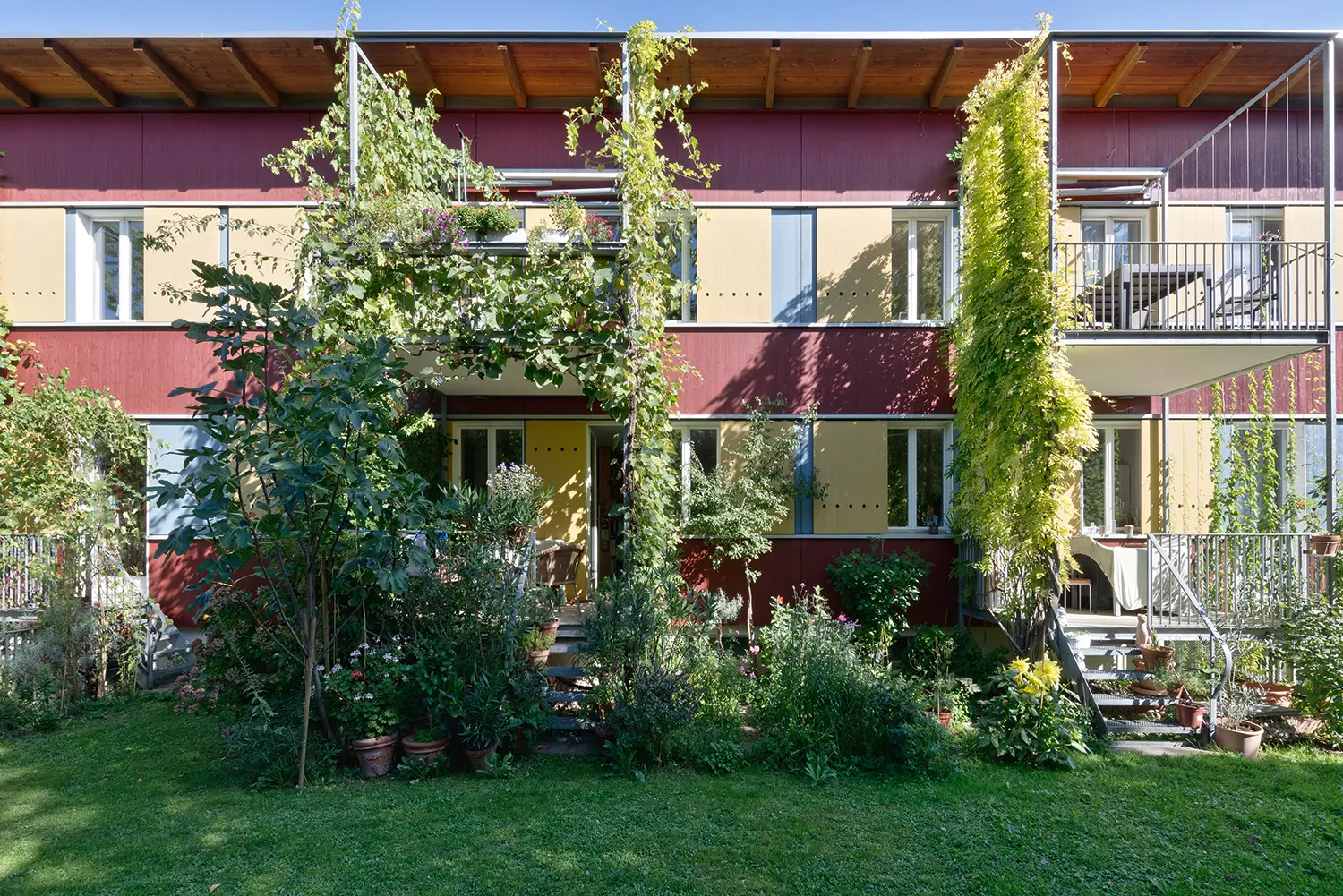 Der in drei Trakte gegliederte Baukörper mit Kopfbau, Mitteltrakt und südlichem Abschluss reagiert differenziert auf den Kontext und schafft vielfältige Freiräume zwischen öffentlichen und halbprivaten Bereichen. Die „Siedlung in einem Haus” umfasst insgesamt 41 Wohnungen, darunter auch 11 betreute und barrierefreie Einheiten, ergänzt durch Gemeinschaftsräume, zuschaltbare Zimmer sowie gemeinschaftliche Infrastrukturen. Flexible Grundrisse ermöglichen eine Anpassung an unterschiedliche Lebensphasen. Balkone und Zugänge sind als begrünbare Lauben ausgebildet. Das kompakte Volumen, die hochwertige Dämmung und die kontrollierte Lüftung sorgen für einen niedrigen Energiebedarf. Ein aktiver Siedlungsverein trägt bis heute zu einem lebendigen nachbarschaftlichen Zusammenleben bei.
