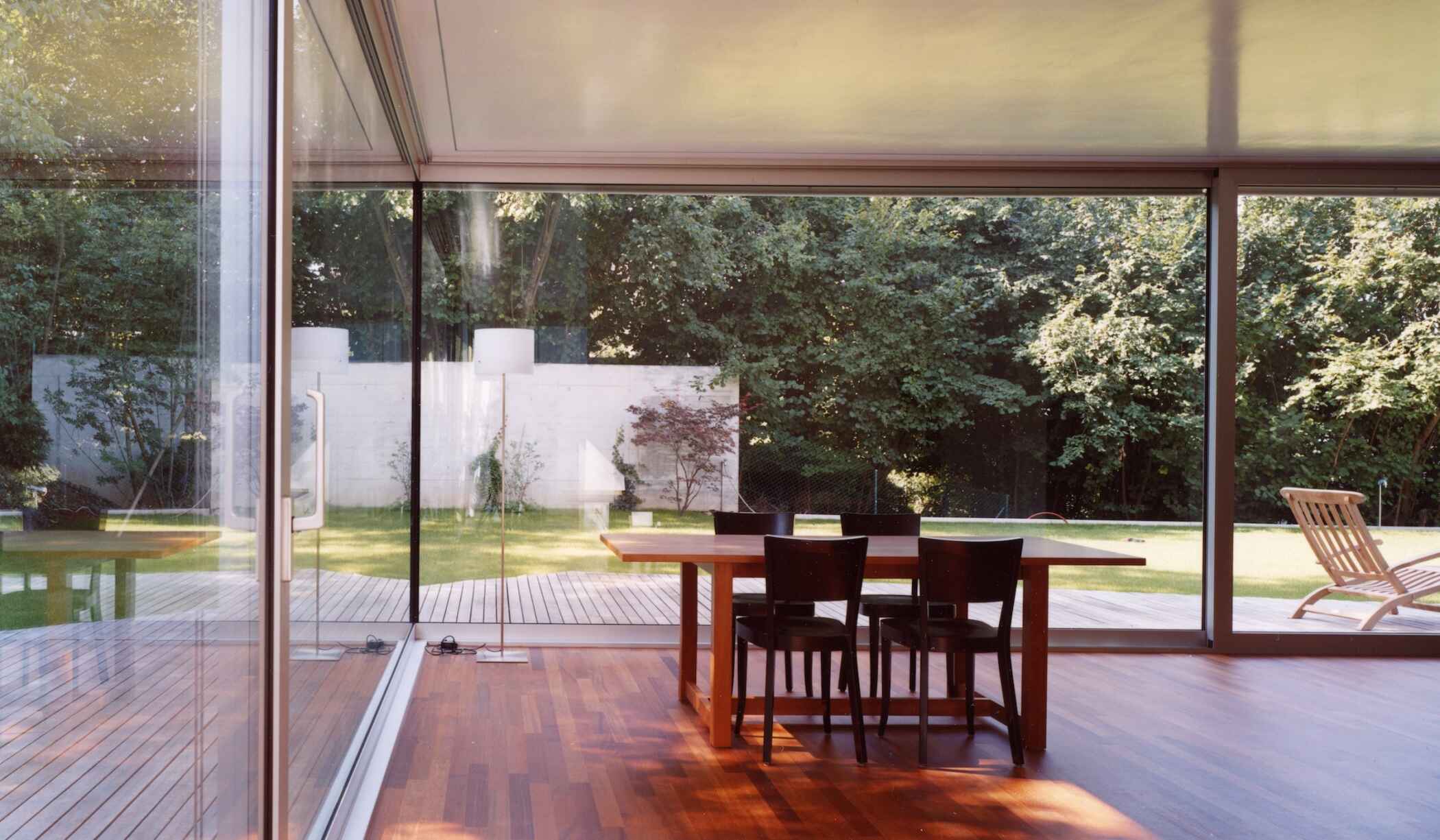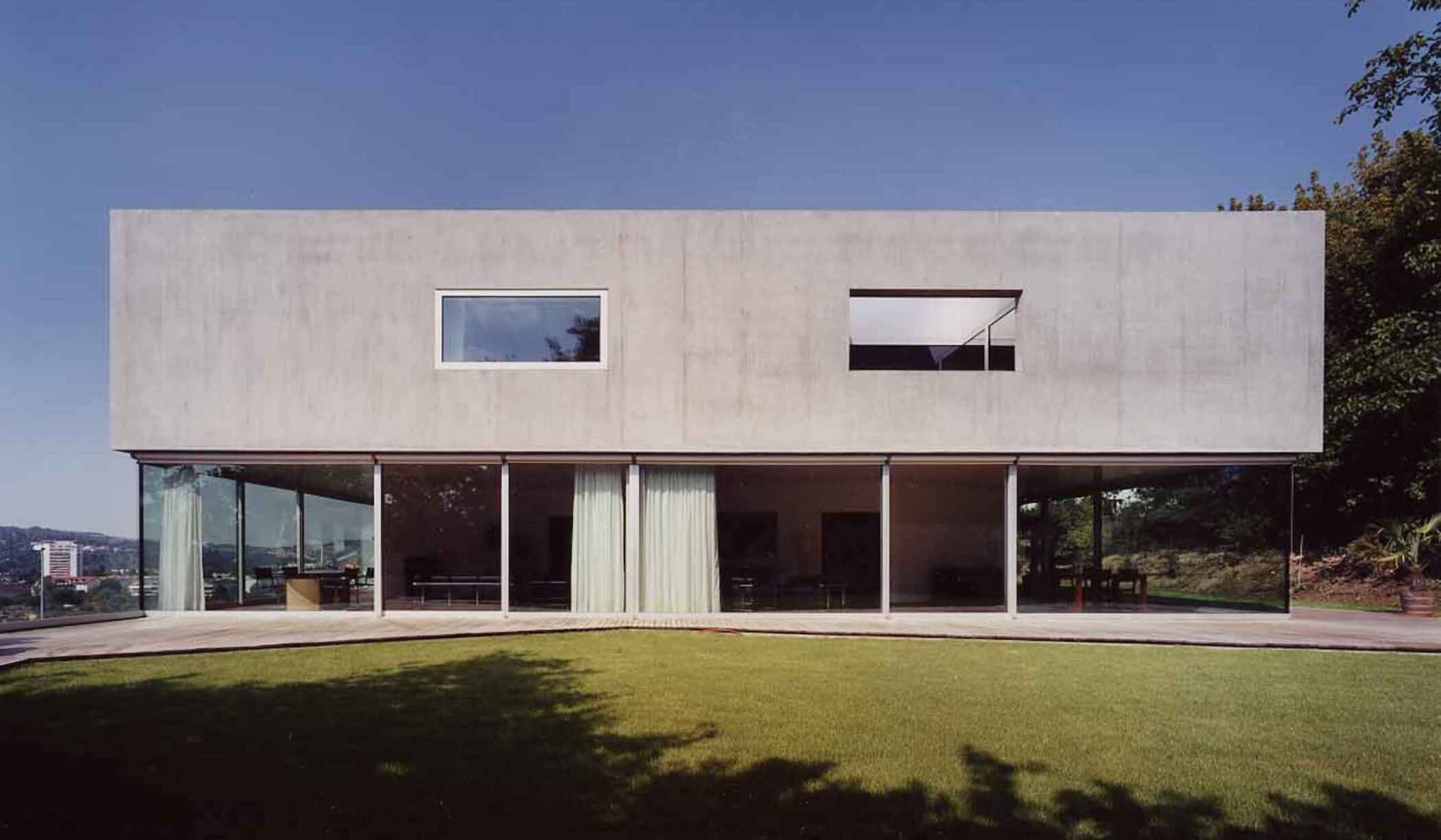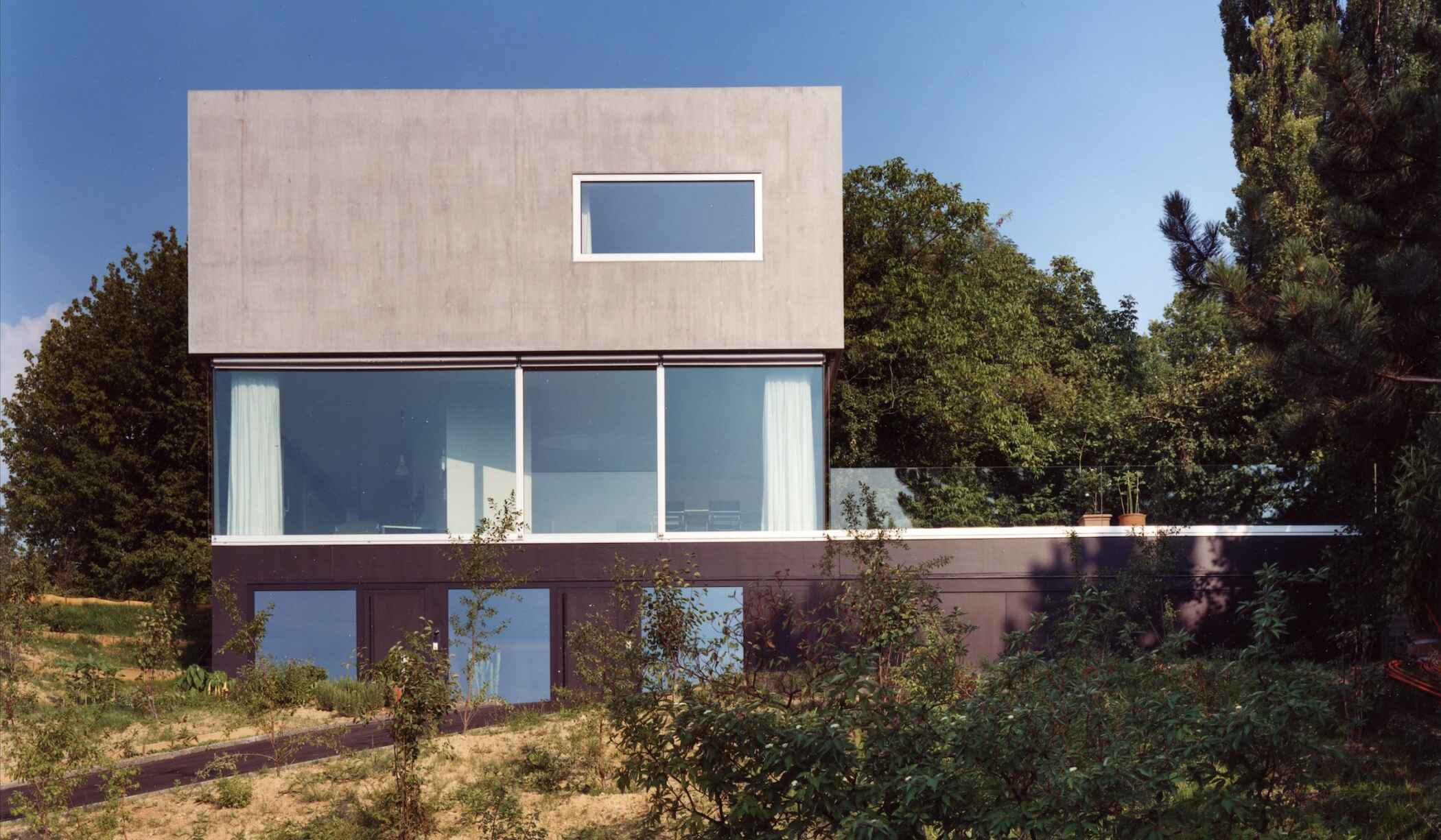 Von aussen vermutet man eine Villa und nicht ein Doppelhaus. Das Haus ist nicht wie bei einem Doppeleinfamilienhaus üblich in der Mitte zweigeteilt, sondern die Grundrisse sind über Kreuz angeordnet. Die Schlafzimmer der einen Partei liegen über Wohnzimmer und Küche der anderen. So haben beide Besitzer trotz der Lage des Hauses quer zum Hang etwas von der Aussicht. Überraschend ist auch die Inszenierung der inneren Erschliessung. Da man das Haus durch den im Erdboden versenkten Sockel betritt, fehlt den Korridoren das Tageslicht. Morger und Degelo haben aus dieser Not eine Tugend gemacht und Korridore und Treppenhäuser dunkelbraun ausgemalt. Umso grösser ist so nach dem dunklen Gang die Wirkung der lichtdurchfluteten Wohnräume.
